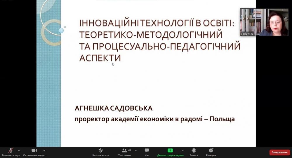 У своїй лекції пані Садовська схарактеризувала особливості системи освіти в Польщі, класифікувала едукаційні методи, що застосовуються польськими педагогами на різних рівнях освіти (дошкільної, основної, вищої), розкрила їхні дидактичні функції, а також висвітлила одну із найактуальніших проблем сьогодення – особливості організації змішаного та дистанційного навчання в період пандемії. Виступ польської ученої супроводжувався змістовною презентацію в українському перекладі, що оптимізувало час навчального заняття і полегшило сприймання нової інформації аудиторією.